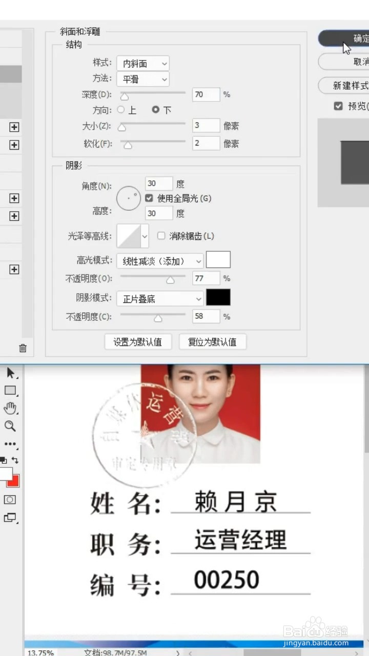 2、样式改为内斜面,大小改为3,软化改为2,点击确定。
